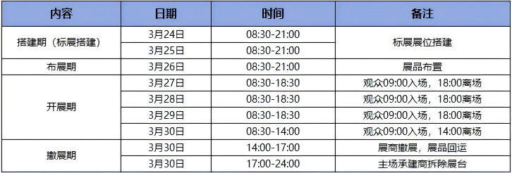 咨询台一张、洽谈桌一张、折椅两把、100W 长臂射灯两支、220V/500W 电源插座一个、垃圾篓一个、中英文楣板一块。了解更多展位结构尺寸图及注意事项可点击查看《标展说明》PDF。