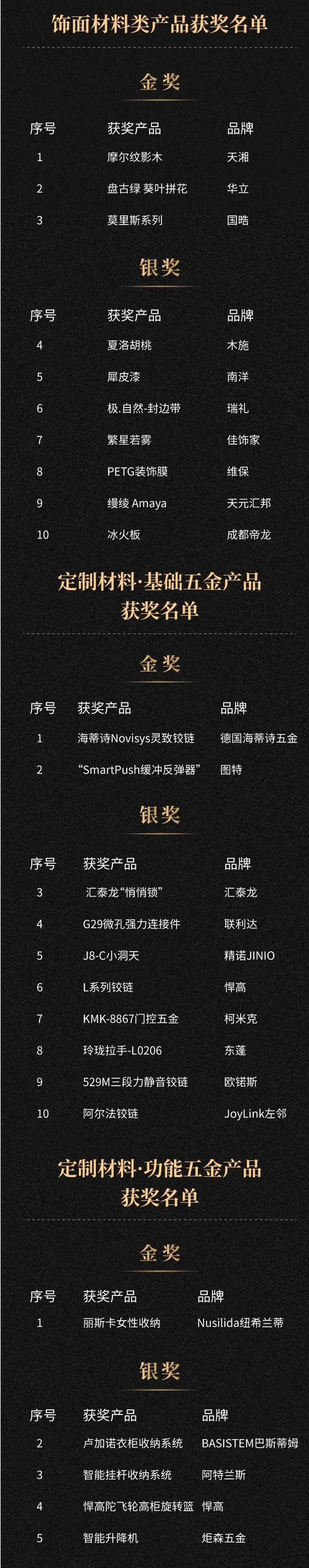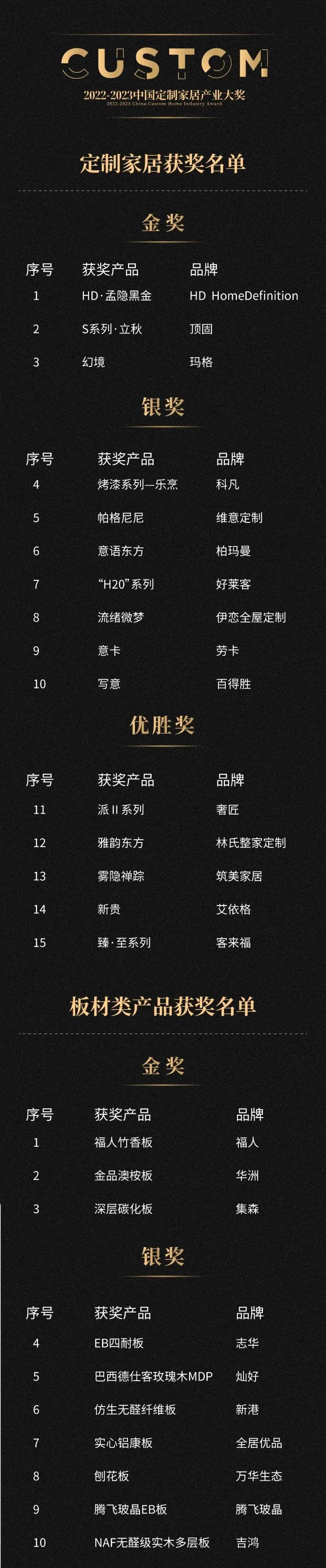 现场,正式颁发了金定奖·2022-2023中国定制家居产业大奖定制家居类金奖、银奖、优胜奖,以及板材类、饰面材料类、基础五金类、功能五金类的金奖、银奖。