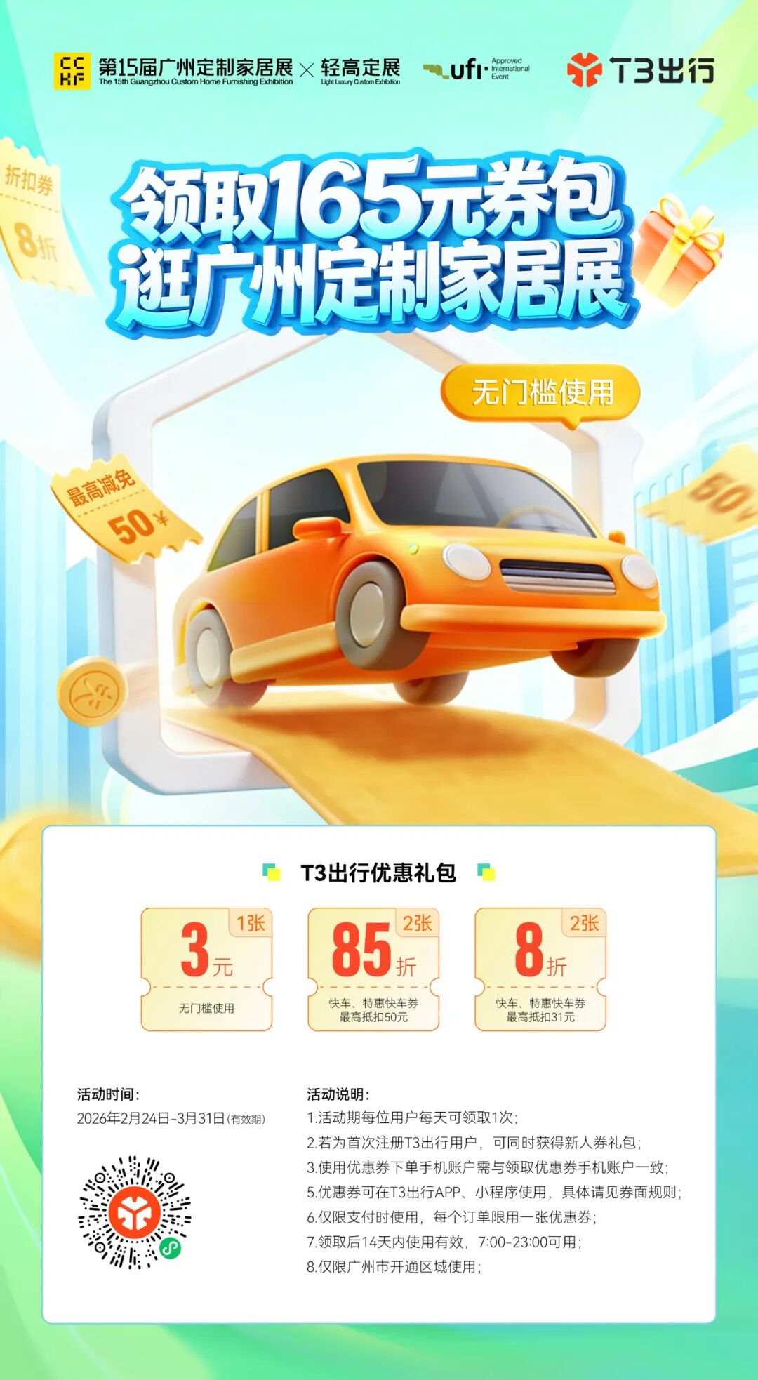 为方便观众出行,主办方携手T3出行,推出展会专属打车优惠券。2026年2月24日-3月31日内,通过专属优惠二维码,到小程序或APP可领取165元打车券包,最高立减50元。
