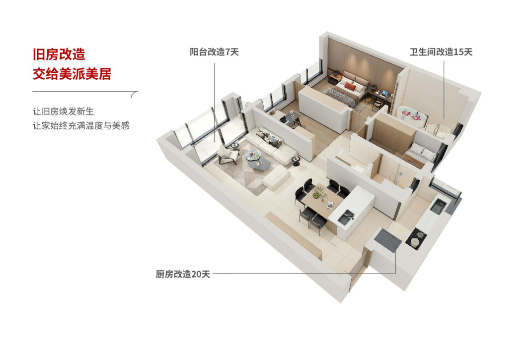 美派美居自主研发快装体系,提供"快、美、省"的一站式改造解决方案。通过标准化流程让工期缩短30%。成本优化达20%以上。深耕全屋焕新、厨卫改造、适老改造、店铺快装等领域,以可复制的标准化模式推动旧改落地。