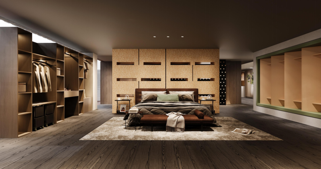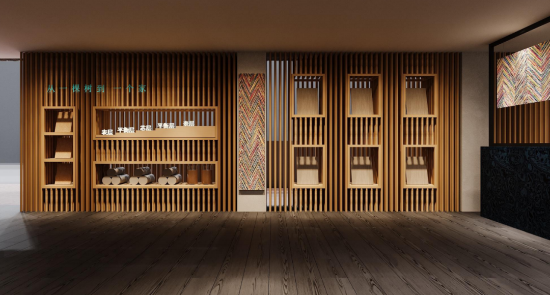 的品牌内核。入口矩阵式展示墙规整呈现全品类纹理、色彩与工艺,产品体系与品质一目了然。内部打造1:1 实景家居空间,板材无缝融入橱柜、衣柜、护墙等场景,可触摸可体验,