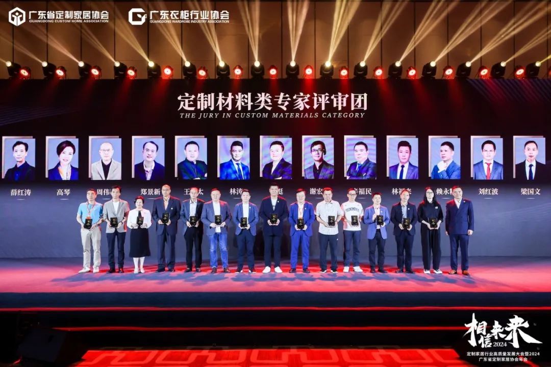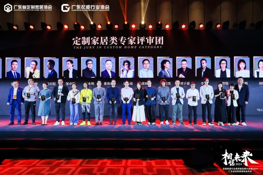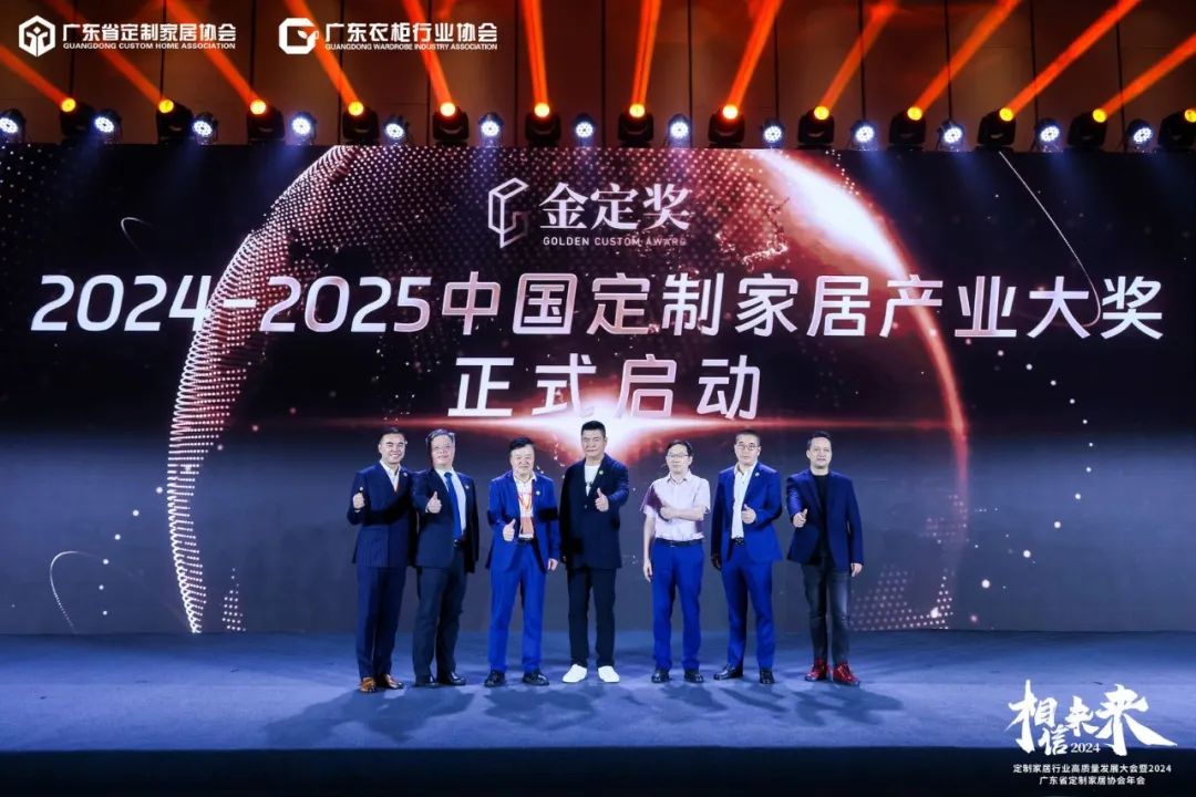 在隆重揭晓了金定奖获奖产品后,广东省定制家居协会荣誉会长&索菲亚家居有限公司集团总工程师张挺、广东衣柜行业协会荣誉会长&科凡家居股份有限公司董事长林涛、广东省定制家居协会会长&尚品宅配总经理李嘉聪、广东衣柜行业协会会长&百得胜家居董事长张健、Stylitaly全案整装公司董事长&米兰国际设计俱乐部副会长&意大利皇室伯爵 董海春、广东工业大学艺术设计学院/副院长/博士/教授张晓刚、广东省定制家居协会秘书长&中国广州定制家居展创始人&博骏传媒创始人曾勇,共同启动金定奖·2024-2025中国定制家居产业大奖。
