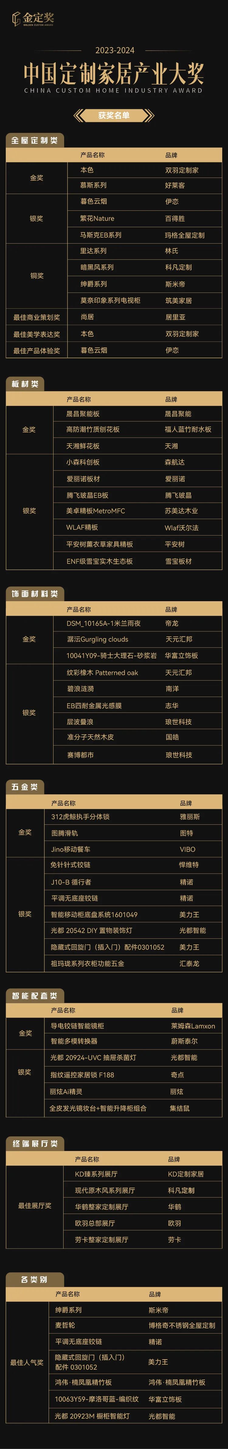 经过评审团严谨的线上初评和展会现场终评,金定奖各项大奖最终诞生。在行业的共同见证下,颁奖盛典现场隆重揭晓各个类别的大奖,包括定制家居类金奖、银奖、铜奖;板材类、饰面材料类、五金类的金奖、银奖;以及最佳展厅奖、最佳人气奖、最佳商业策划奖、最佳美学表达奖、最佳产品体验奖等单项奖。