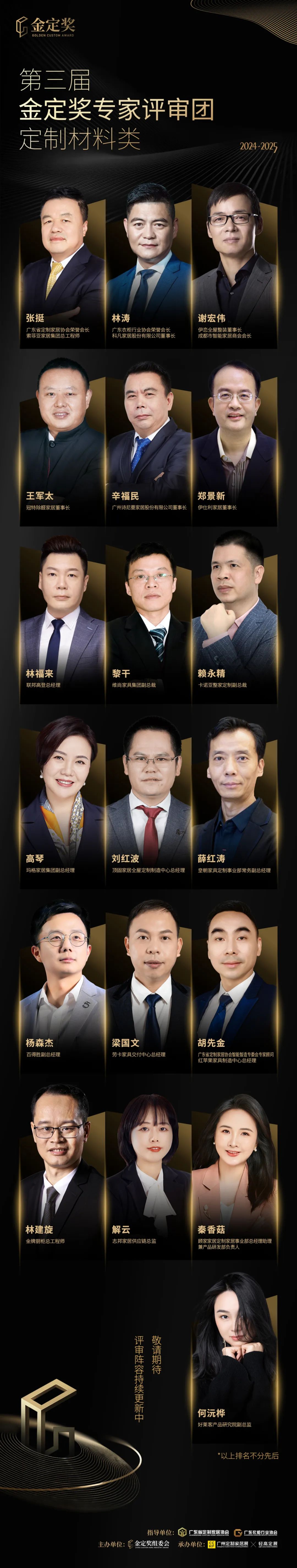 本年度金定奖在延续往届评审团阵容的基础上,进一步扩大了邀请范围,特别邀请了众多国内外设计协会的杰出专家、意见领袖等重量级人物加入评审团,共同参与本年度评审工作。评审团将以国际化的视野和标准,精心甄选中国定制家居行业中的卓越产品及先进技术,评选出最具代表性和引领性的行业精品。