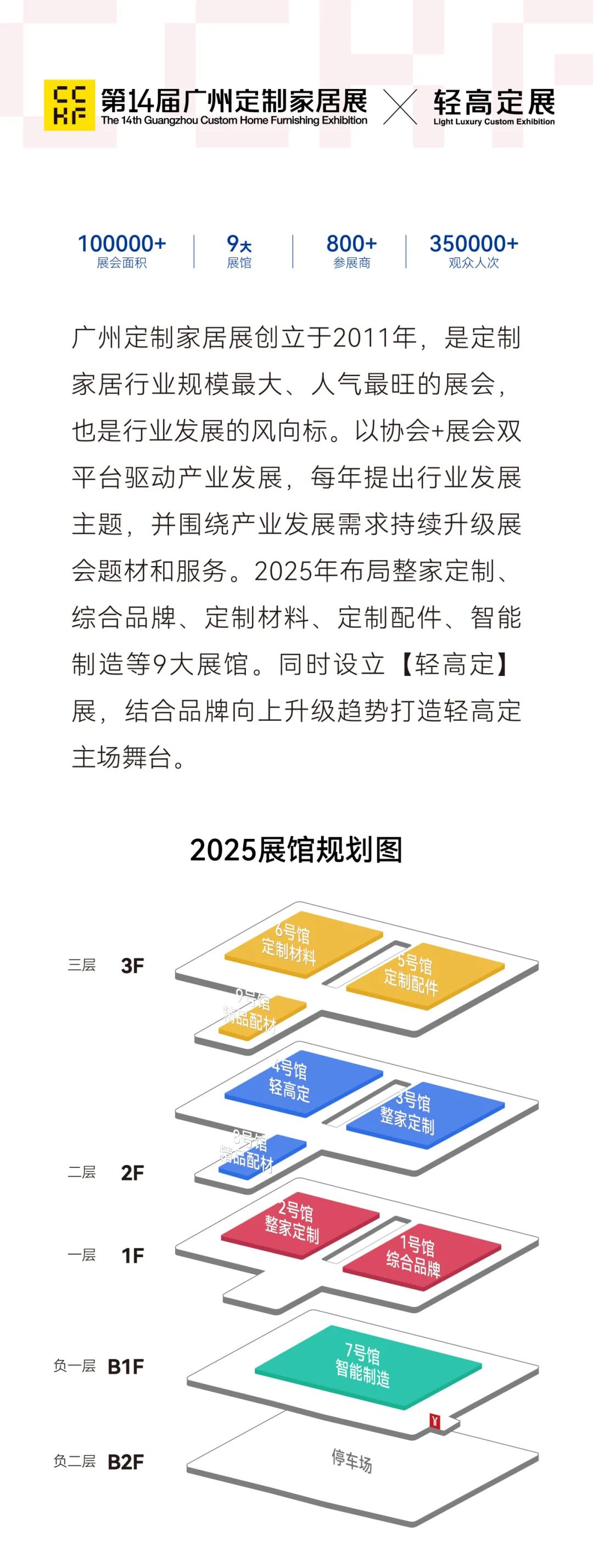 展会每年3月27-30日在广州保利世贸博览馆举行,展览面积10万㎡,汇聚全国近千家企业、35万+人次观众。展会围绕“定制+整家”发展主轴,参展商囊括整家定制、轻高定、定制配件、定制材料、智能制造、智能家居/家电、家具等品类。近年轻高定成为行业转型主赛道,聚焦产业向轻高定升级需求,展会倾力打造中国轻高定主场,助推行业迈向以品质生活为驱动力的时代。