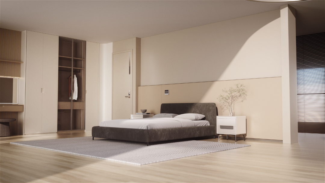 智能康氧卧房:双开新风门丨木皮激光雕刻新风墙丨空净茶柜丨金属渐变漆