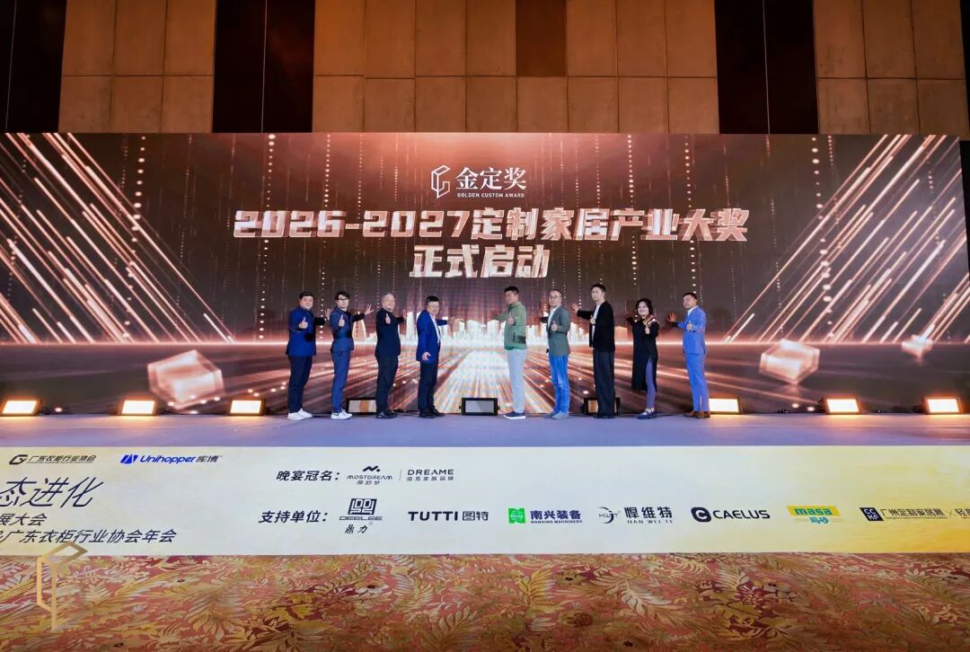 在隆重揭晓了金定奖获奖产品后,由金定奖发起人、广东省定制家居协会荣誉会长、索菲亚家居集团总工程师 张挺,金定奖发起人、广东衣柜行业协会荣誉会长、科凡家居董事长 林涛,广东省定制家居协会会长、尚品宅配总经理 李嘉聪,广东衣柜行业协会会长、百得胜家居董事长 张健,建筑学博士、竹工凡木设计集团创始人 邵唯晏,ENJOYDESIGN创始人/总设计师 郭捷,德国包豪斯大学中国区负责人/德国包豪斯设计精英大师协会秘书长 马山山,马来西亚室内装潢伙伴协会主席 郑生财,广东省定制家居协会秘书长、广州定制家居展暨轻高定展创始人 曾勇共同启动金定奖·2026-2027定制家居产业大奖。